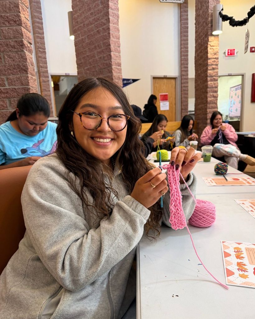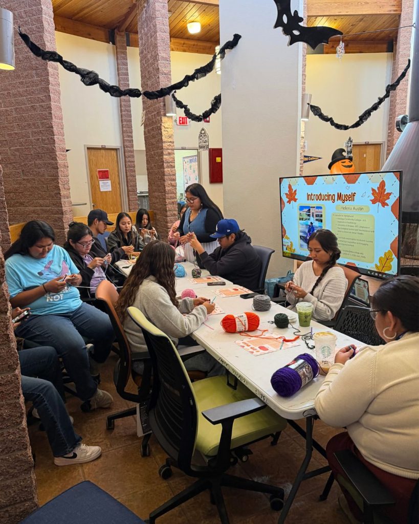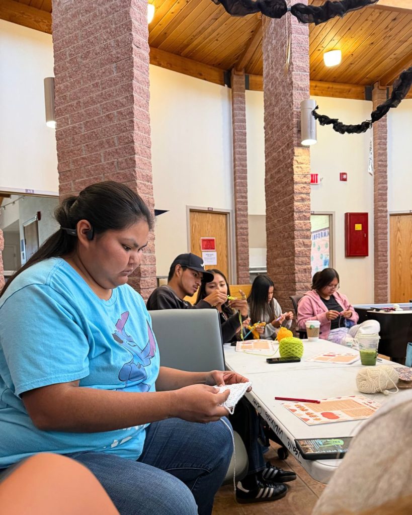This crocheting workshop was held by Helena Austin on October 28, at the Student Wellness Center, here in Tsaile, Arizona. It was a very welcoming space; many students were interested in learning and wanted to participate. The intentions of this workshop were to create a supportive and engaging learning environment for students. I was able to participate and try crocheting myself, which was a very confusing learning process, but I was able to catch on and get the hang of it. It was a very welcoming and supportive event, which I really enjoyed, lots of laughter and enjoying each other’s company.